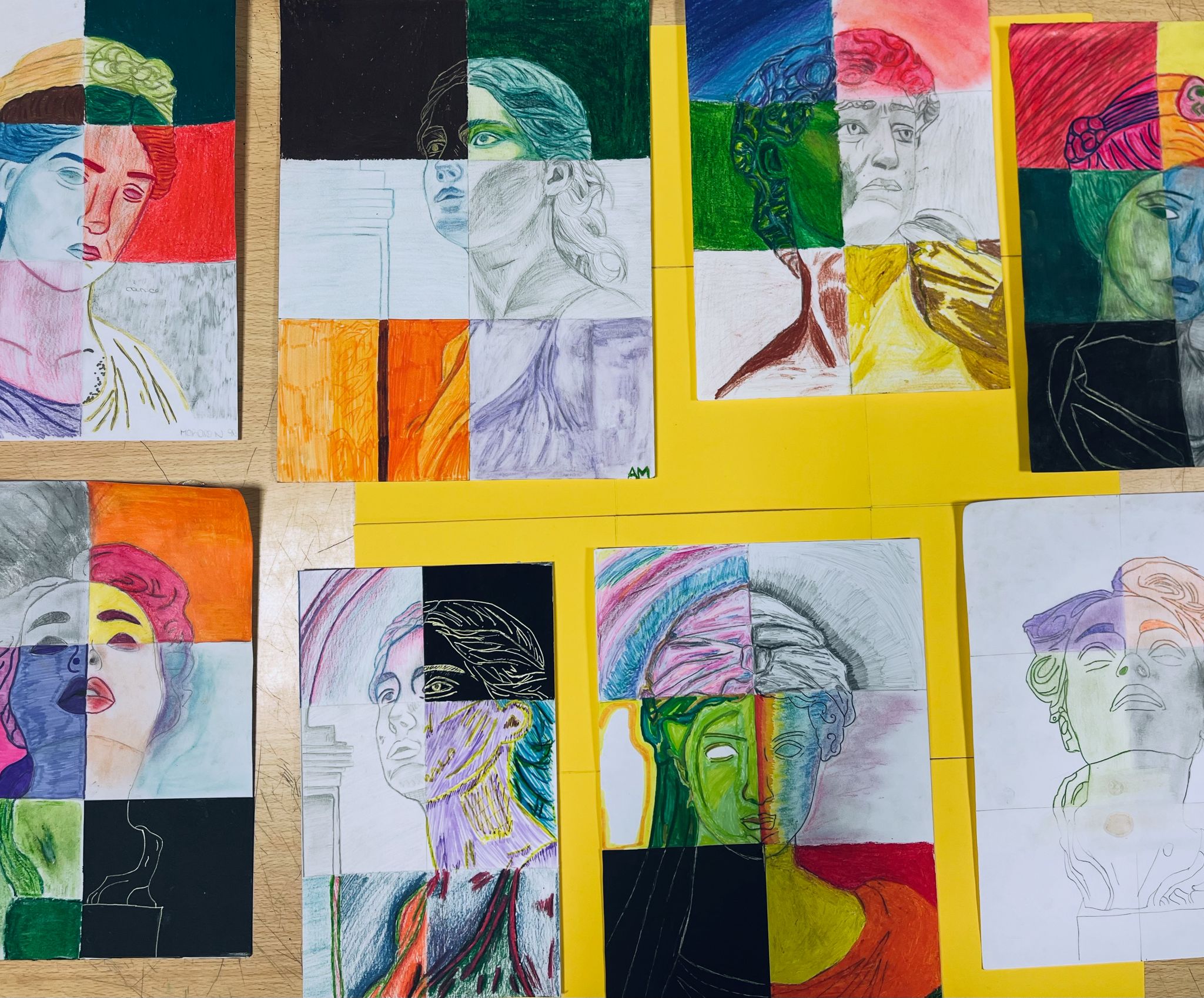 Os trabalhos do 9.º ano – 3.º ciclo, partem de imagens de estátuas, algumas reconhecidas da História da Arte, como o David de Miguel Ângelo, e outras menos conhecidas. O desafio consistiu em “dar vida às estátuas”, transformando uma figura escultórica e monocromática numa representação expressiva e contemporânea. Cada trabalho foi realizado sobre um suporte dividido em seis partes iguais, nas quais os alunos aplicaram cores, técnicas e materiais diferentes, com total liberdade criativa, evitando a repetição de soluções em áreas adjacentes. Este projeto reflete um maior grau de autonomia, experimentação e maturidade artística, característico de alunos que se encontram no último ano do seu percurso no 3º ciclo.